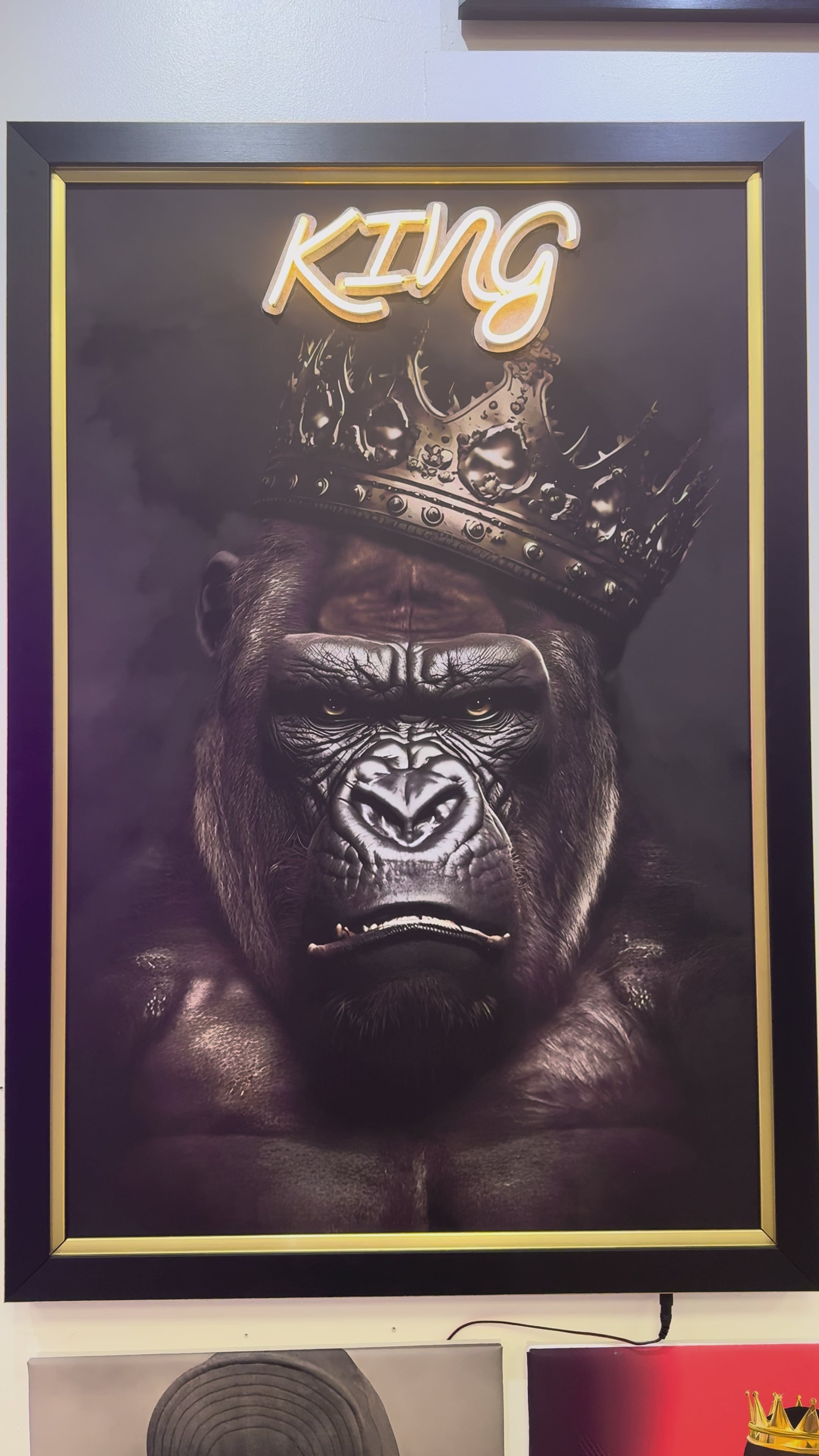 Step into the wild power of dominance and authority with this electrifying gorilla portrait. The piercing golden eyes, the heavy crown, and the glowing KING neon text come together to create an artwork that is both intimidating and majestic.