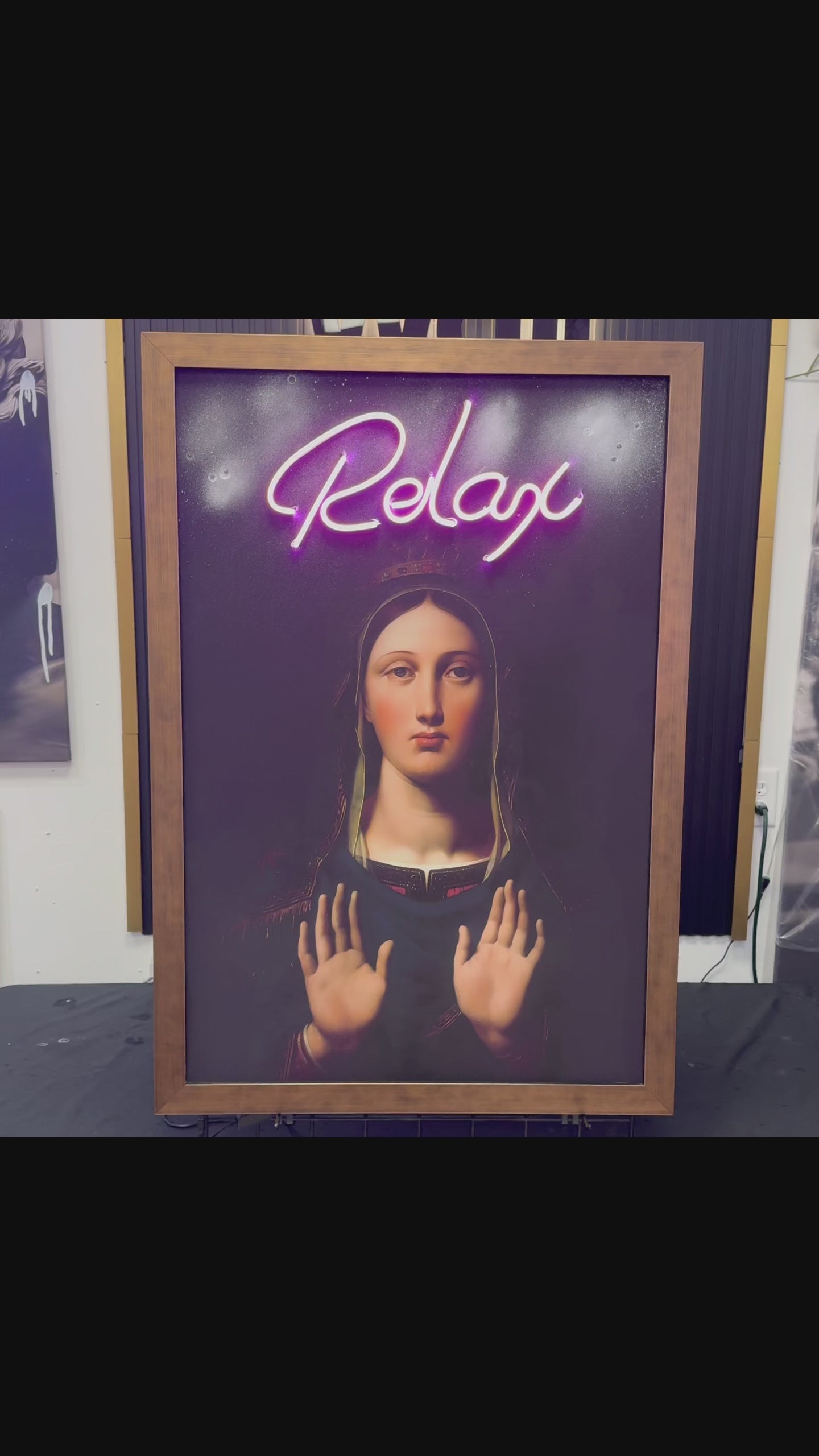A timeless Renaissance-inspired portrait of the Virgin Mary, reimagined with a modern neon light that spells “Relax.”This piece blends classical art with contemporary design, creating a bold focal point for any space.